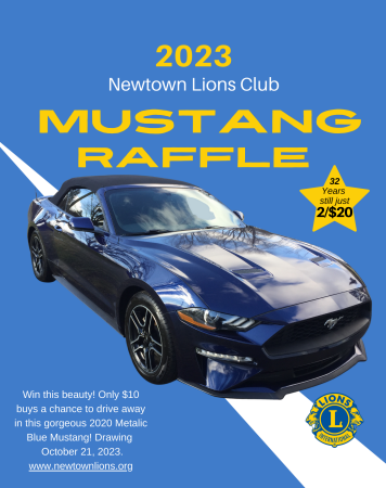 The Newtown Lions Club 2023 Mustang Car Raffle Be a Winner - Help us Serve Or 10 for $100 Go for it!